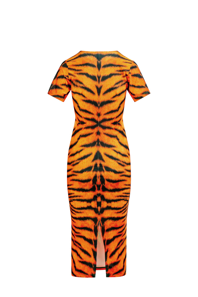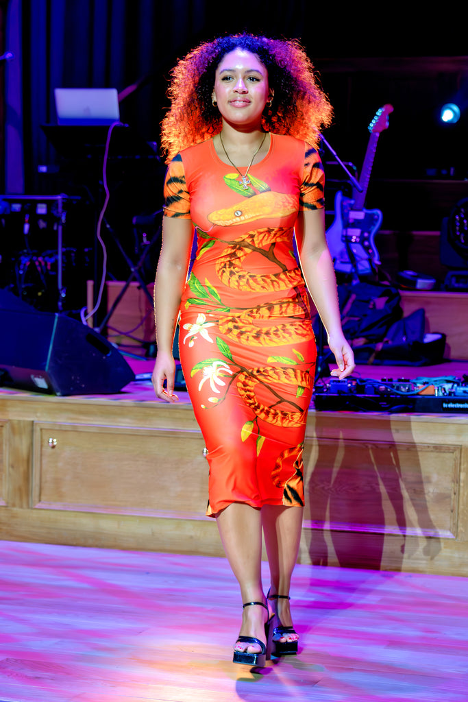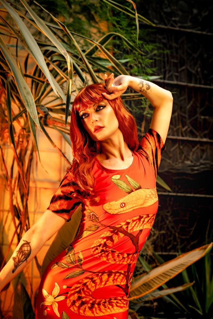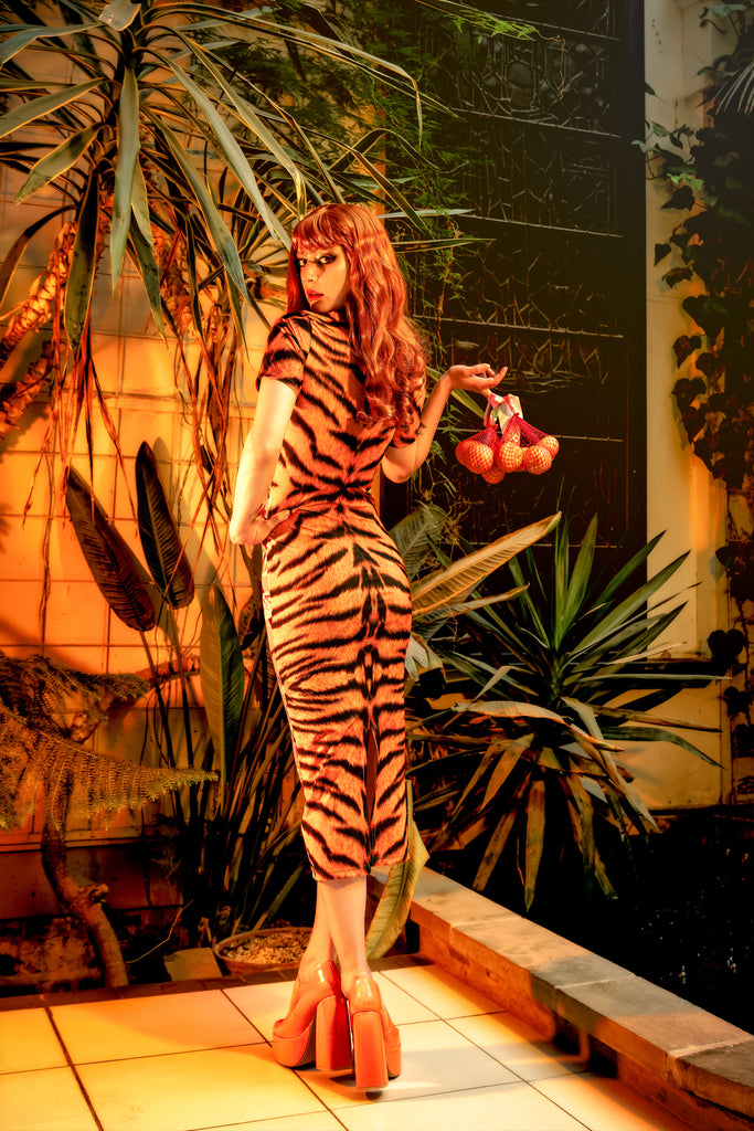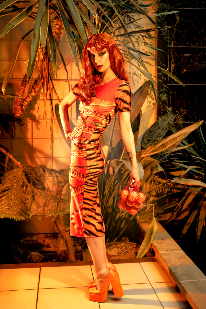 Named after my favorite preserve, MARMALADE has the bright effervescence of orange, with a hint of danger! The front of the dress features an oversize print of my original snake art, while the back of the dress has a dramatic tiger print for an extra kick of drama. A pattern for when you need a little zest in life!