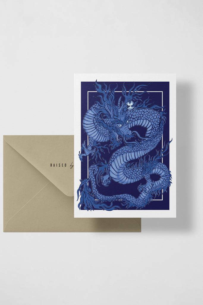 Inspired by various blue and white porcelain designs from around the world, but with a bit of an edgy twist! The card features a large dragon print on the front, while on the back various art pieces mix together as part of my porcelain inspired print. It's time to break out the FINE CHINA!